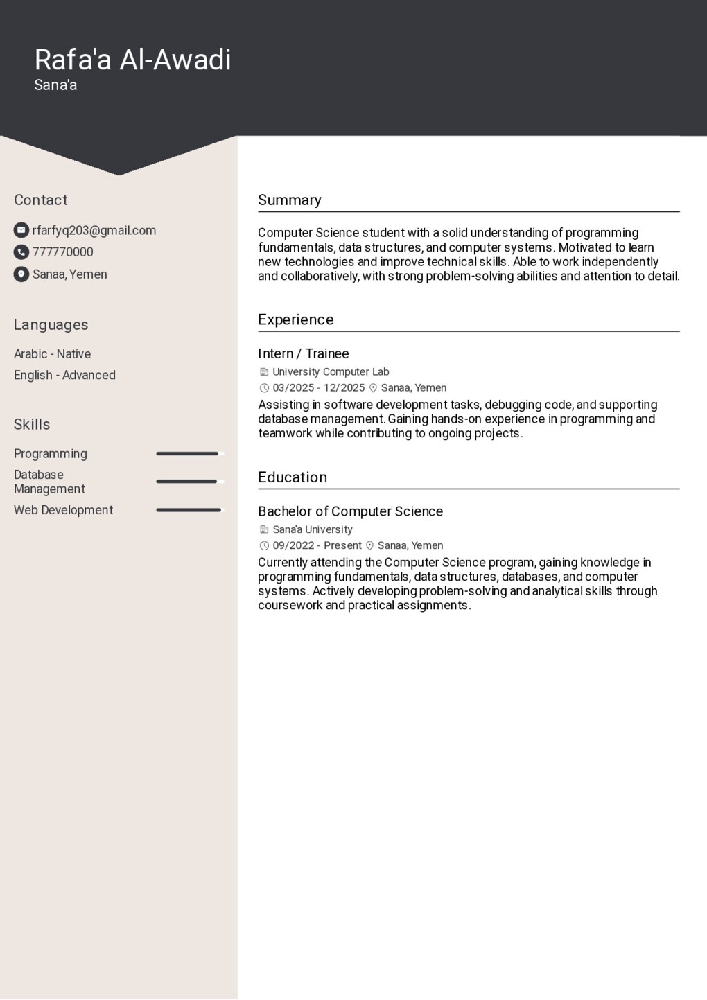Example resume for Sana'a in Sanaa, Yemen